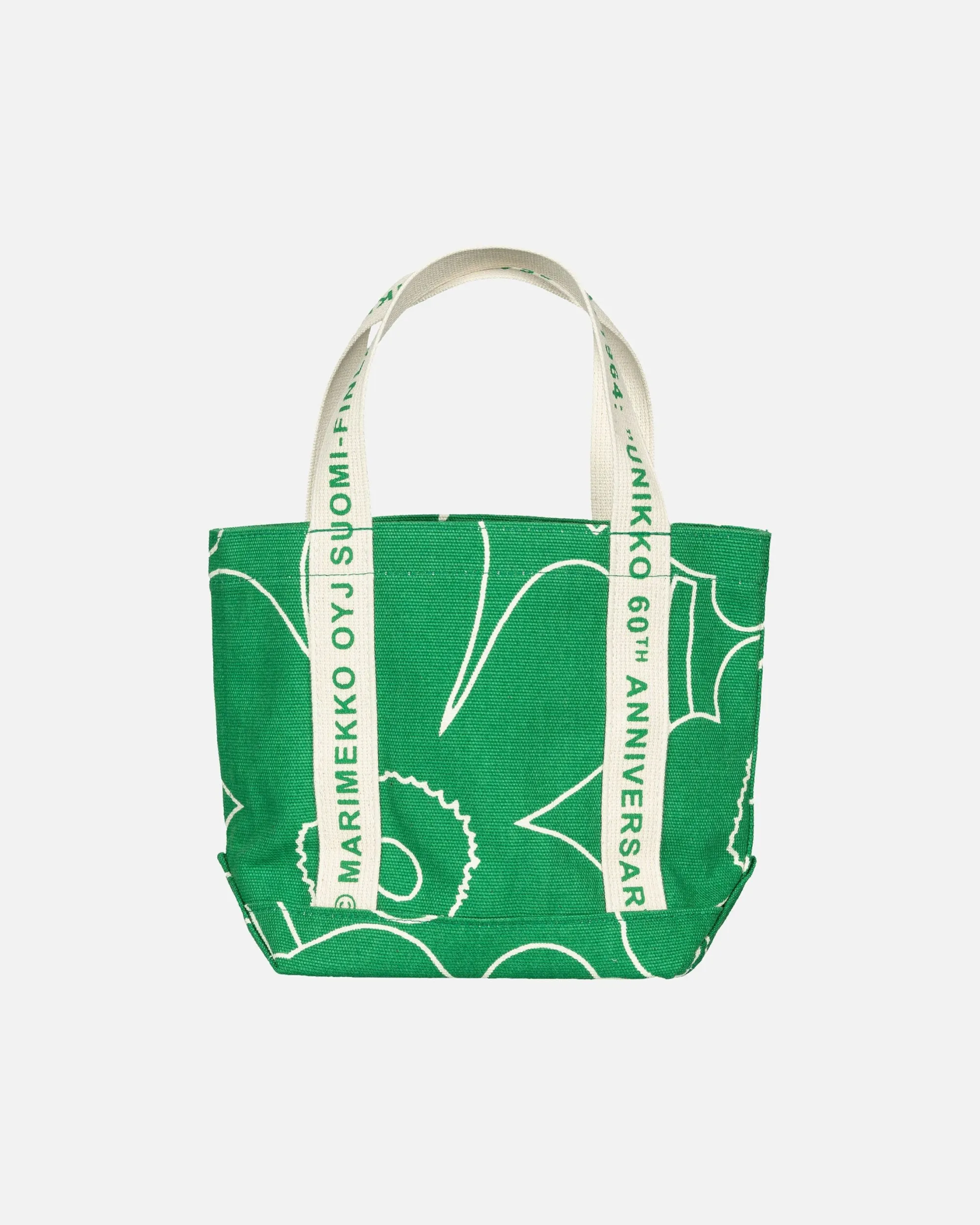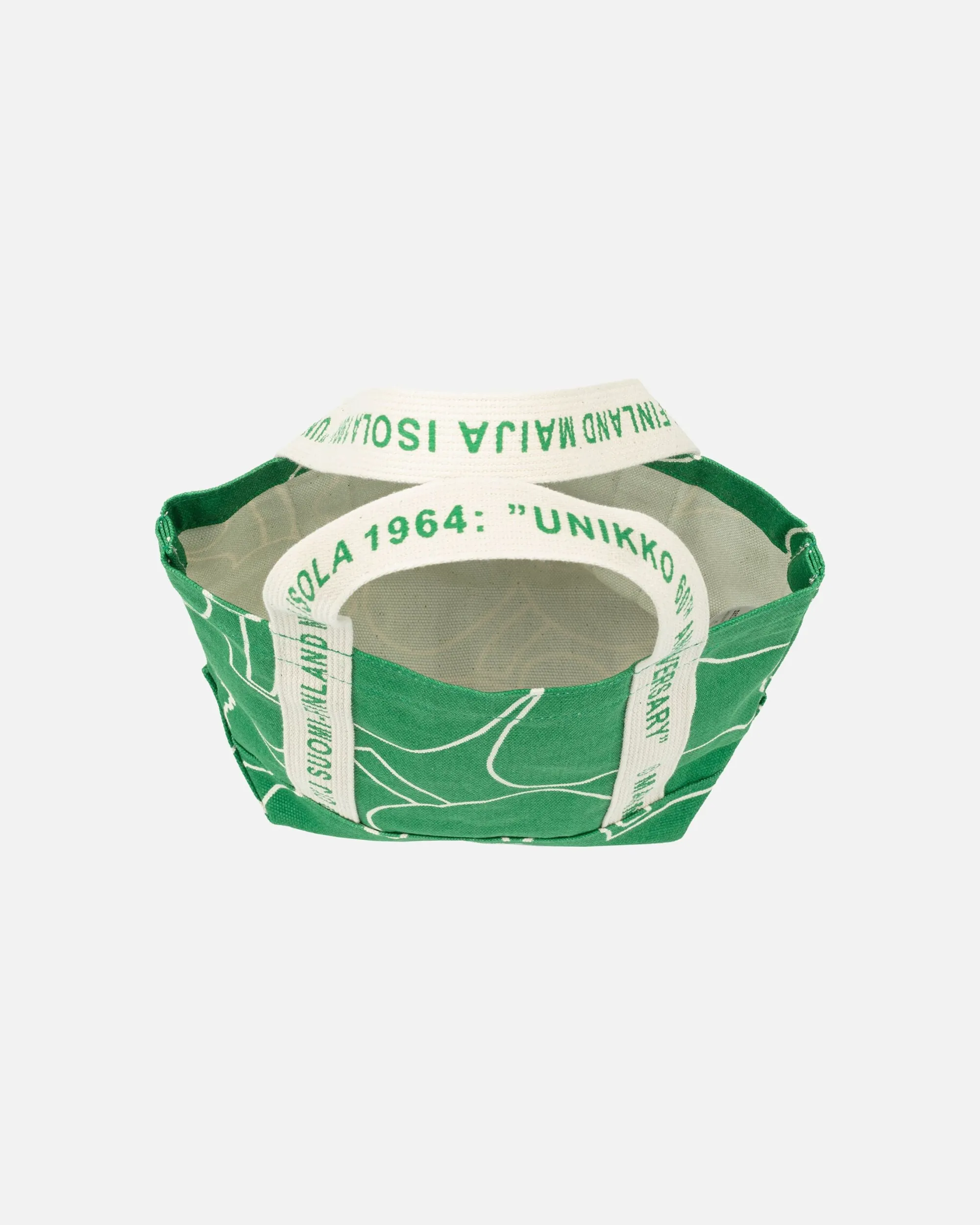 Carrier Mini -Laukku On Valmistettu Valkaisemattomasta, Piirto Unikko -Kuosisesta Puuvillapellavasta, Joka On Painettu Helsingissä. Marimekko Kioski -Tekstillä Painettu Puuvillanauha Kulkee Laukun Päällä Muodostaen Samalla Laukun Kantokahvat.