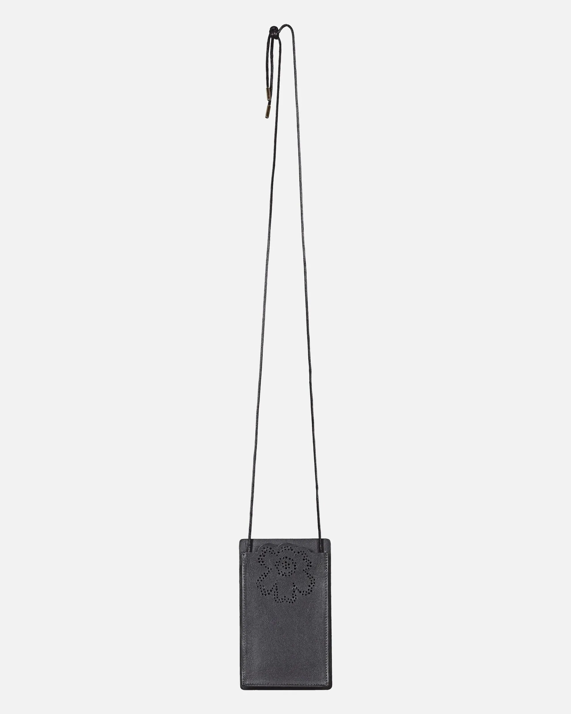 Imprint Phone Pocket -Laukku On Valmistettu Jäljitettävästä Skandinaavisesta Nahasta. Etupuolen Pitsimäinen Unikko-Kukka Muodostuu Pienistä Rei’Istä. Laukussa On Kolme Korttipaikkaa Takapuolella Sekä Vahattu Puuvillahihna, Jonka Pituutta Voi Säätää Solmulla.