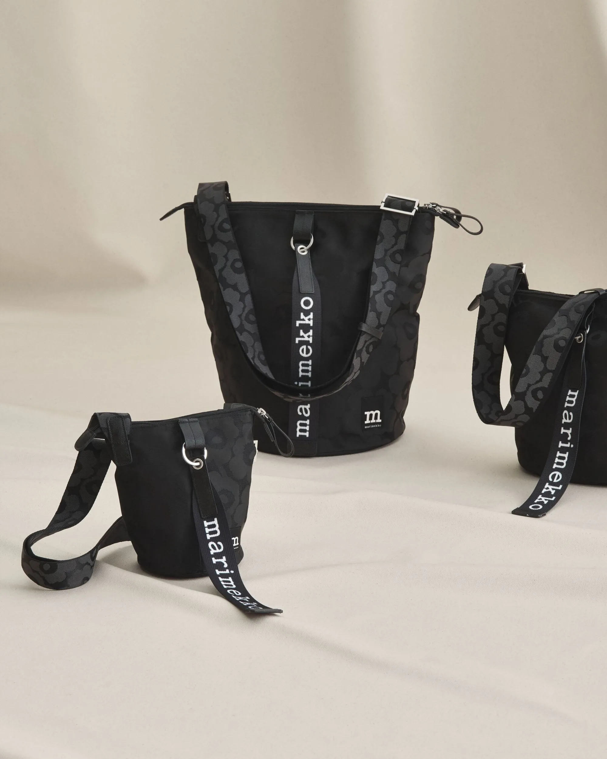 Pienessä Laukussa On Vetoketjukiinnitys Ja Säädettävä Olkahihna. Etupuolelle On Kiinnitetty Marimekko-Avaimenperä Ja Takapuolella On Yksi Avoin Tasku. Laukussa On Nahkaisia Yksityiskohtia.