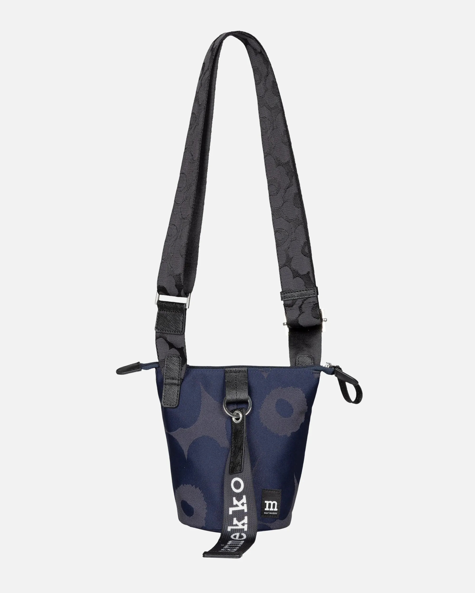 Essential Bucket -Olkalaukku On Valmistettu Kierrätetystä Polyesteristä, Jossa On Jacquard-Kudottu Unikko-Kuosi. Pienessä Laukussa On Vetoketjukiinnitys Ja Säädettävä Olkahihna. Etupuolelle On Kiinnitetty Marimekko-Avaimenperä Ja Takapuolella On Yksi Avoin Tasku. Laukussa On Nahkaisia Yksityiskohtia.