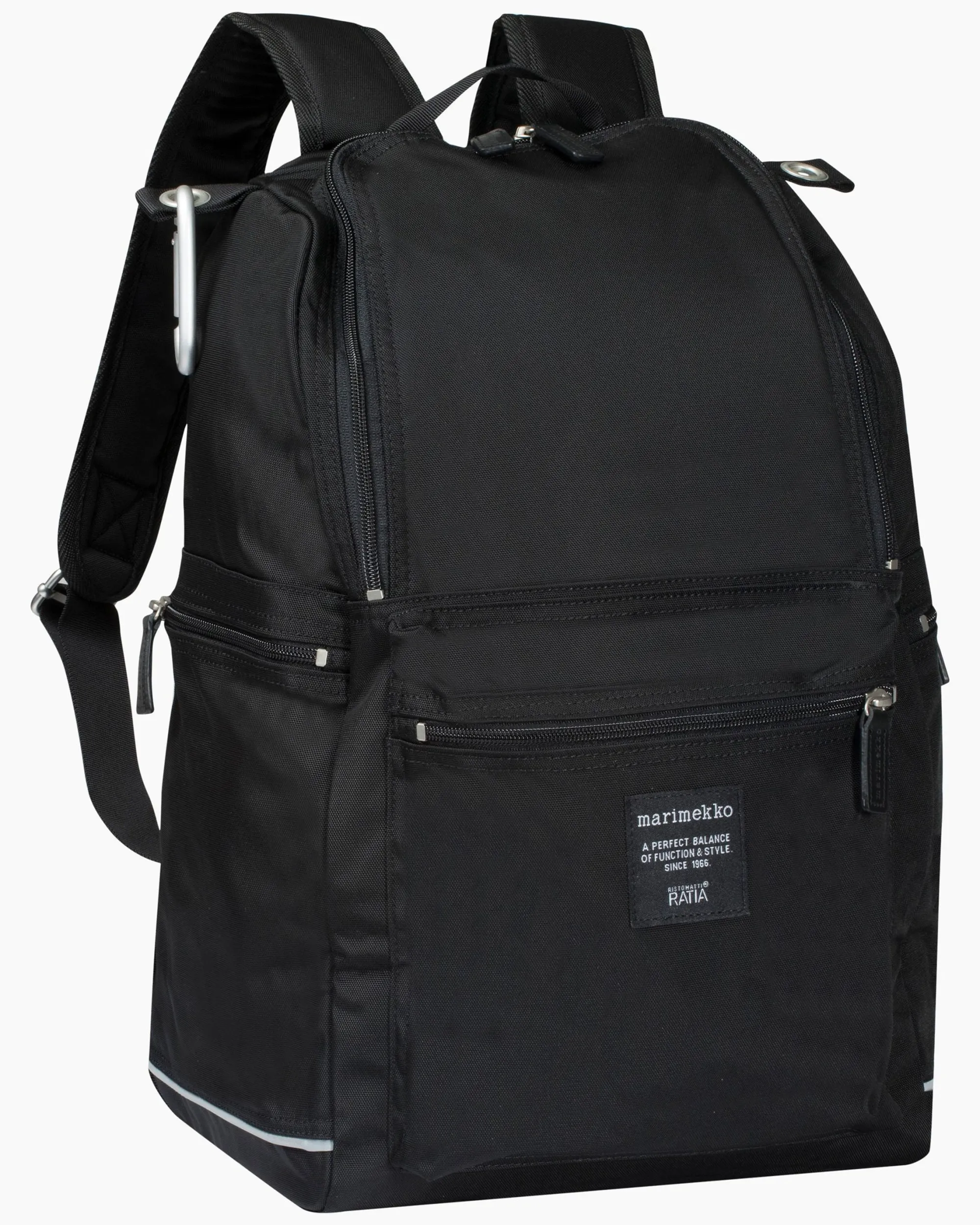 Polyamidista Valmistetussa Repussa On Pehmustetut Ja Säädettävät Olkahihnat Sekä Kolme Vetoketjullista Ulkotaskua. Sisäpuolella On Selkäpehmuste Ja Vetoketjullinen Verkkotasku.