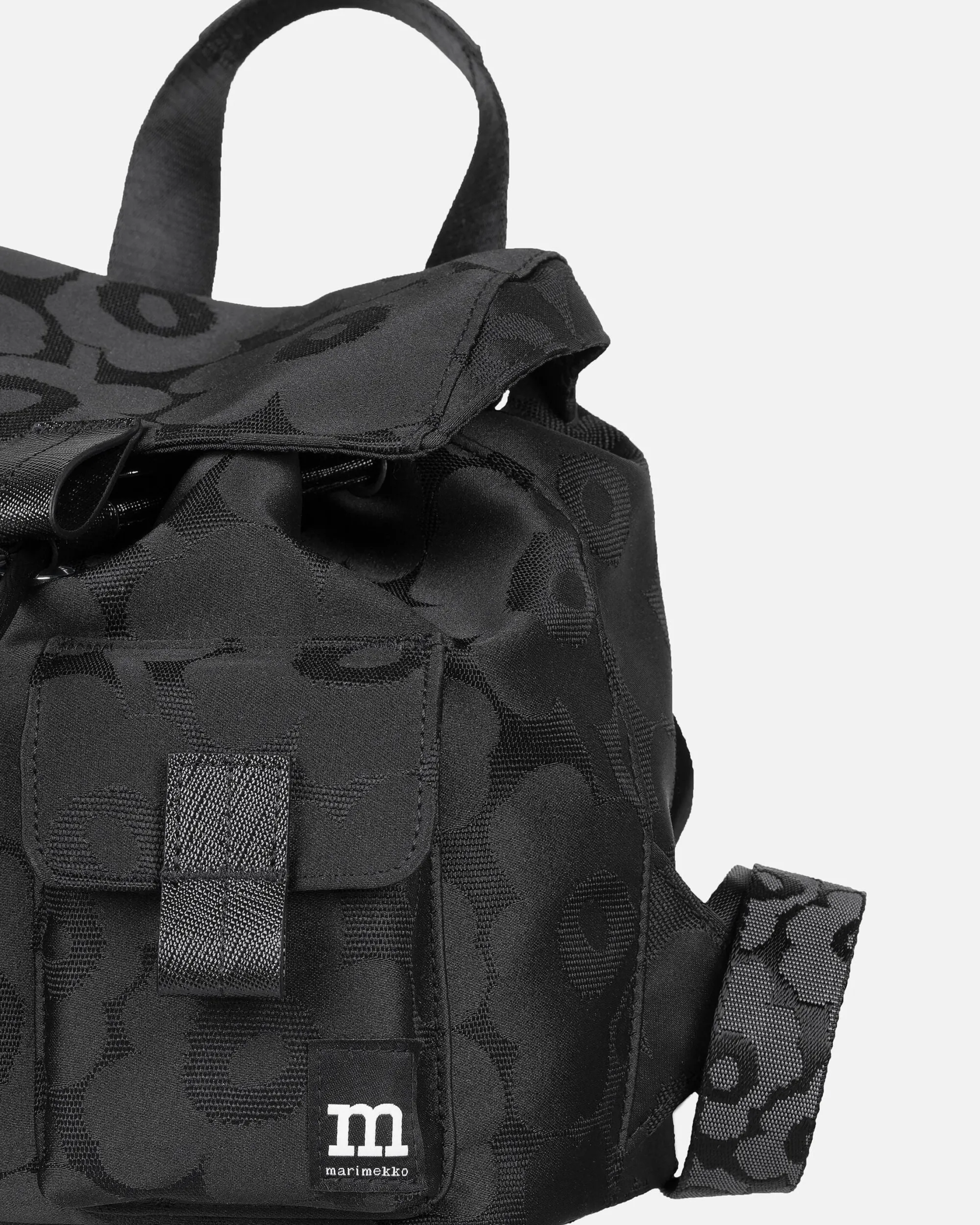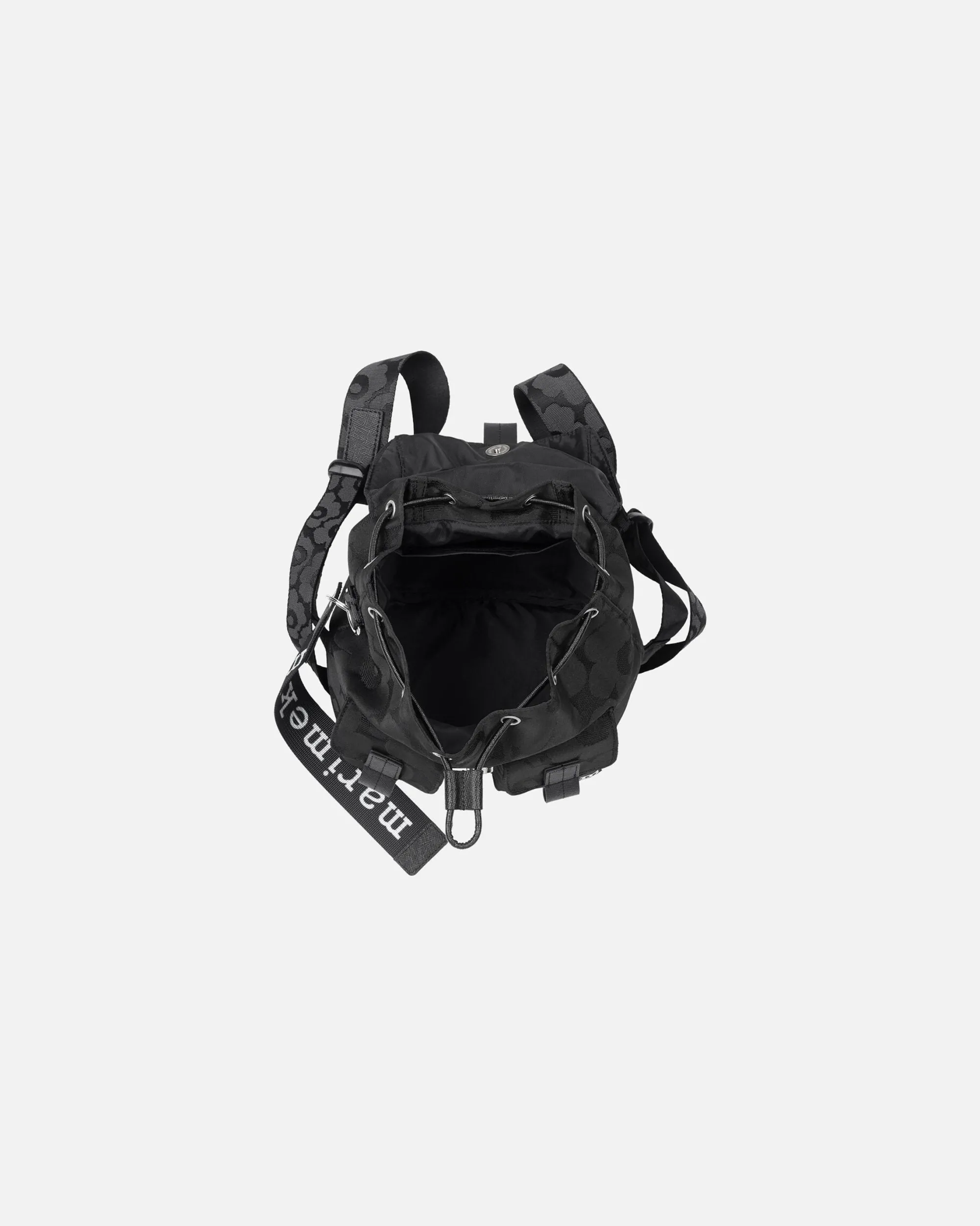 Repussa On Kiristysnyörillä Suljettava Suuaukko, Magneettinapilla Kiinnittyvä Kansiläppä Sekä Kaksi Etutaskua Magneettinapeilla. Olkahihnat Ovat Säädettävät. Toiselle Sivulle On Kiinnitetty Marimekko-Avaimenperä. Selkäpuolella On Yksi Avoin Tasku. Laukussa On Nahkaisia Yksityiskohtia.