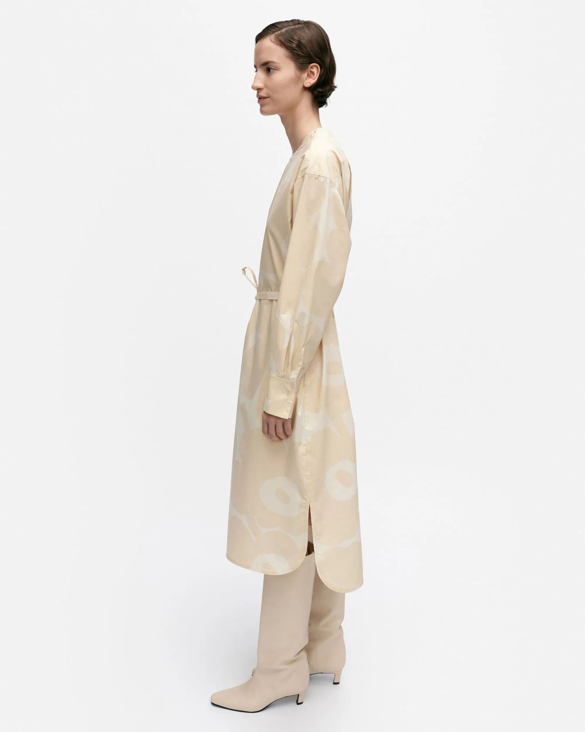 Unikko-Kuosinen Febina-Mekko On Valmistettu Luomupuuvillapopliinista Ja Siinä On Rento Istuvuus Ja Suora Leikkaus. Mekossa On Piilovetoketju Vasemmalla Olalla Ja Kapea, Irrallinen Vyö. Hihansuissa On Halkiot Ja Napitettavat Mansetit Ja Helmassa On Pyöristetty Leikkaus Sekä Sivuhalkiot.
