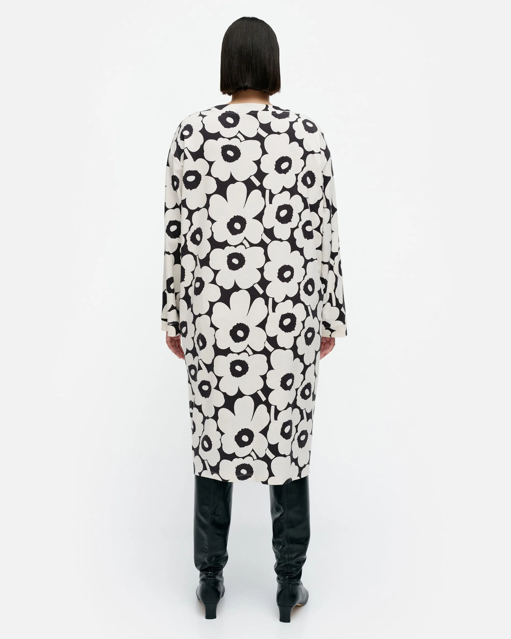 Piata-Puuvillatrikoomekossa On Väljä Istuvuus, Suora Leikkaus Ja Unikko-Kuosi. Mekossa On Leveä Kuosillinen Resori Venepääntiessä Ja Väljät Pitkät Hihat, Joissa On Leveät Resorit Hihansuissa.