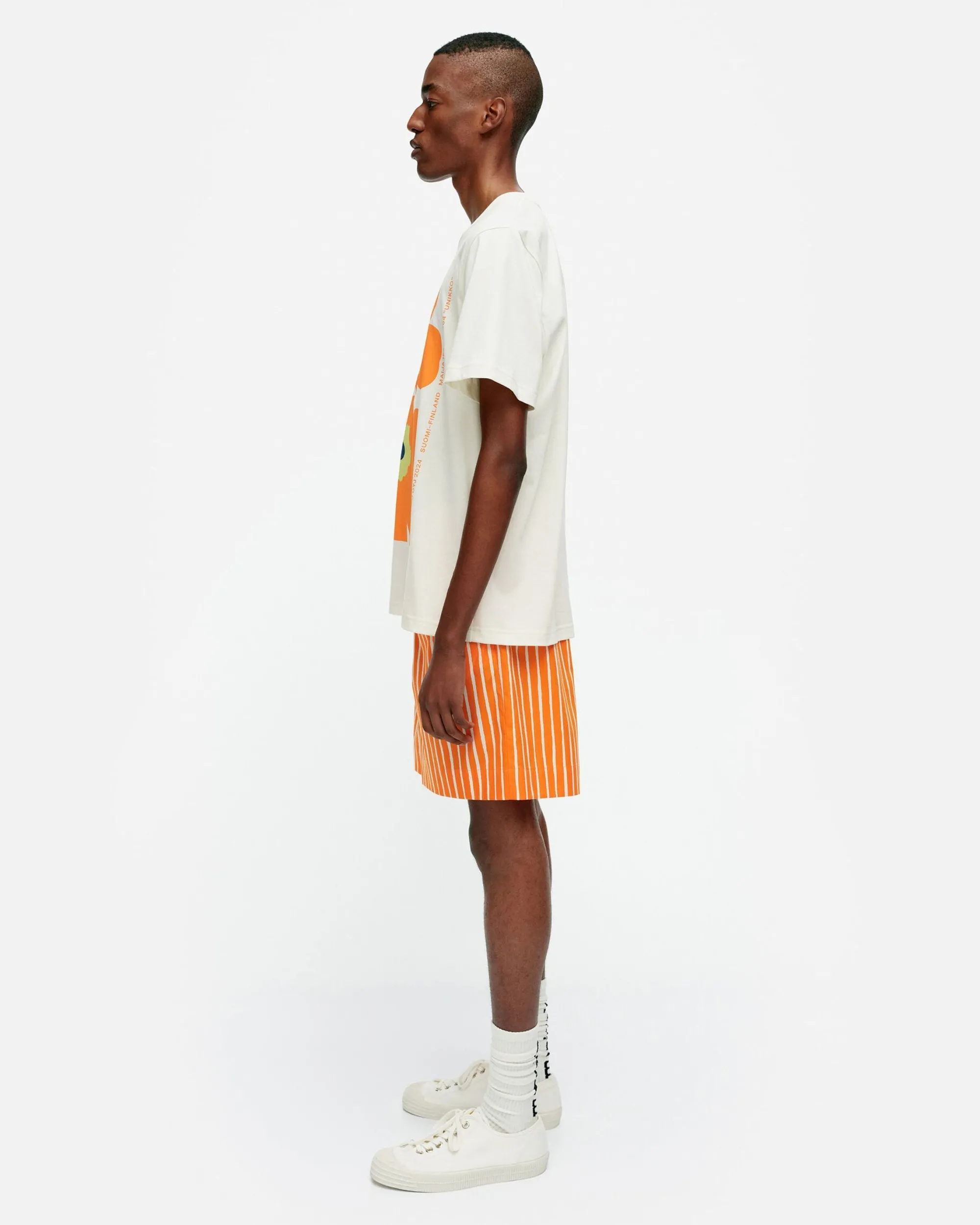 Embla-T-Paita On Valmistettu Luomupuuvillatrikoosta Ja Siinä On Miesten Mitoitus. T-Paidassa On Resori Pyöreässä Pääntiessä Ja Kappalepainettu Unikko-Kuosi Sekä Marimekon Printtiteksti Edessä.