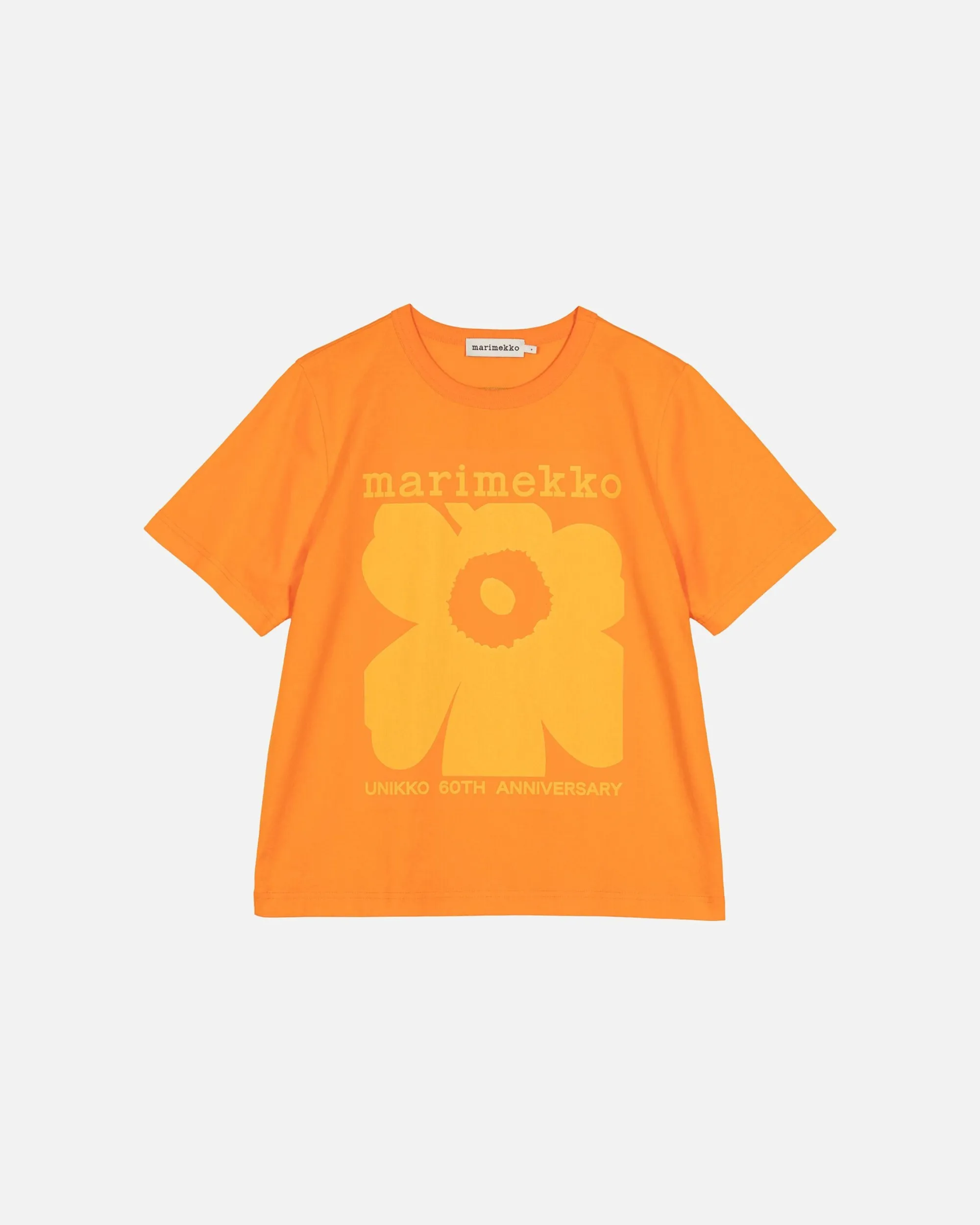 Erna-T-Paita On Valmistettu Luomupuuvillatrikoosta Ja Siinä On Rento Istuvuus. T-Paidassa On Suuri Unikon 60-Vuotisjuhlavuosiprintti Etupuolella Ja Resori Pyöreässä Pääntiessä.