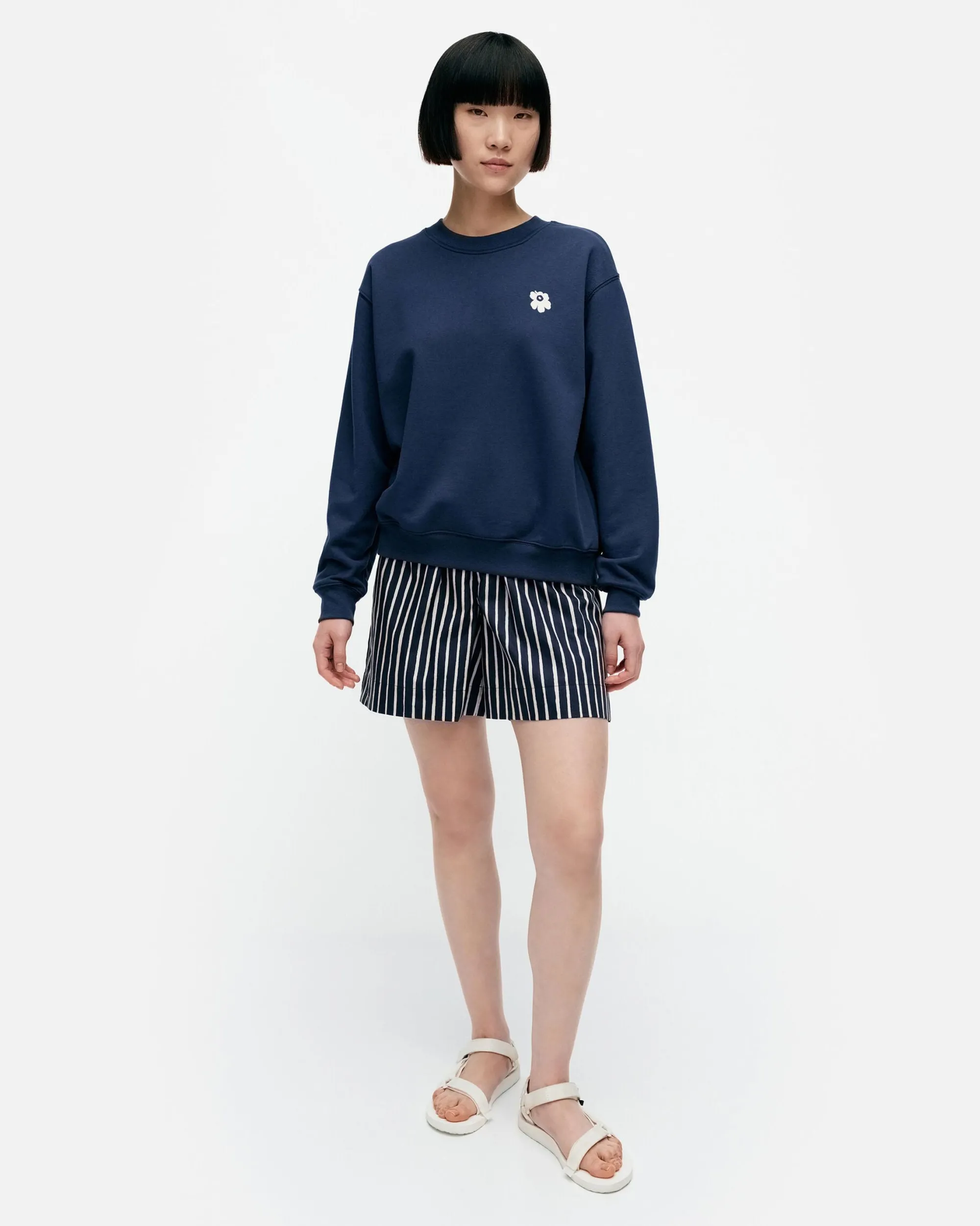 Puuvillacollegesta Valmistetussa Leiot-Paidassa On Rento Istuvuus Ja Etupuolella Kappalepainettu Unikko -Kuosin Kukka. Tuotteen Sisältämästä Puuvillasta 25 Prosenttia On Peräisin Marimekon Trikootuotteiden Valmistuksessa Syntyneestä Hukkamateriaalista. Collegepaidassa On Resorikantilla Huoliteltu Pyöreä Pääntie Ja Hihansuissa Sekä Helmassa On Leveät Resorit.