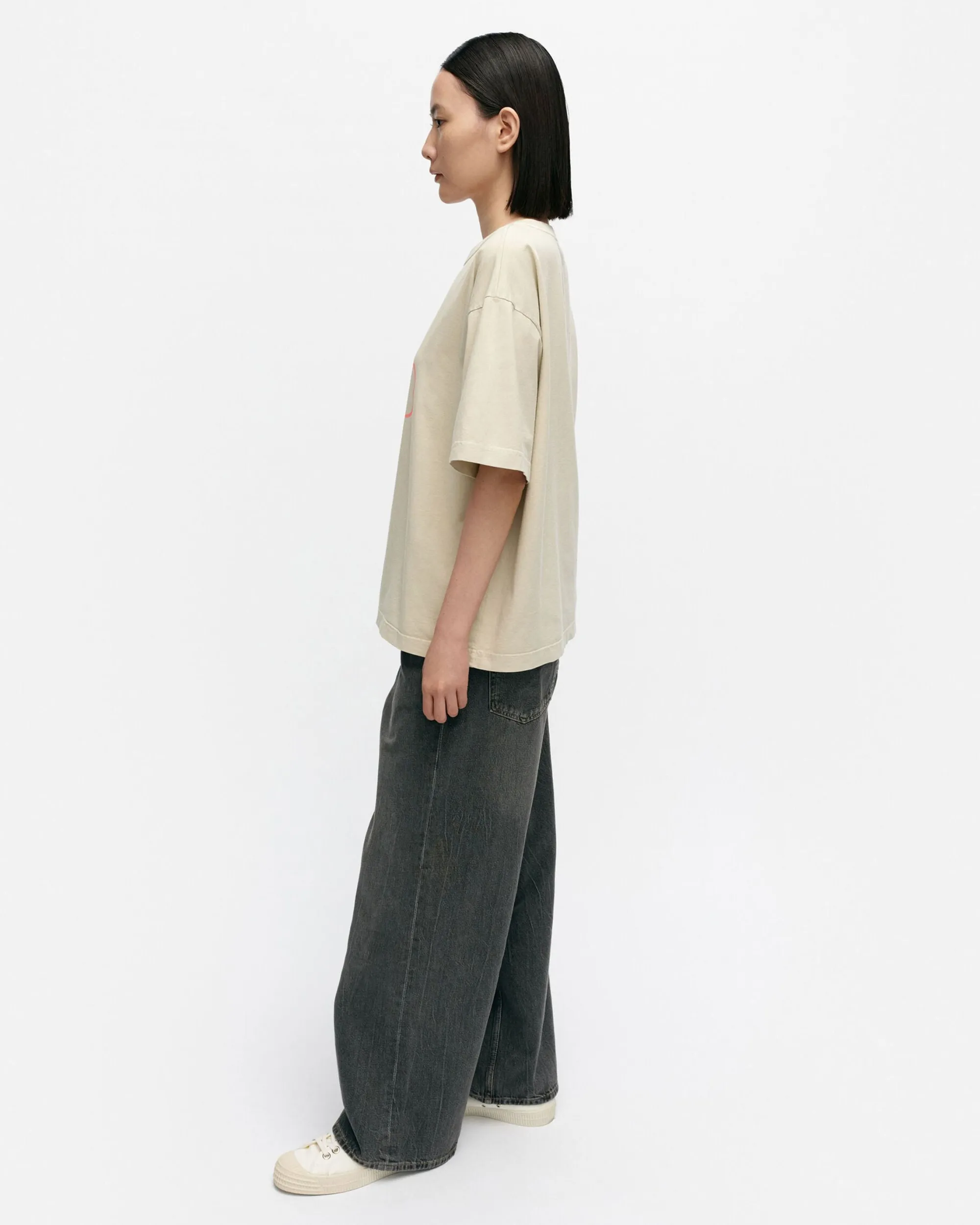 Veig-T-Paita On Valmistettu Mineraalivärjätystä Luomupuuvillatrikoosta Ja Siinä On Väljä Istuvuus. T-Paidassa On Neonvärillä Painettu Piirto Unikko -Kuosin Kukka Etupuolella Ja Leveä Resori Pyöreässä Pääntiessä.