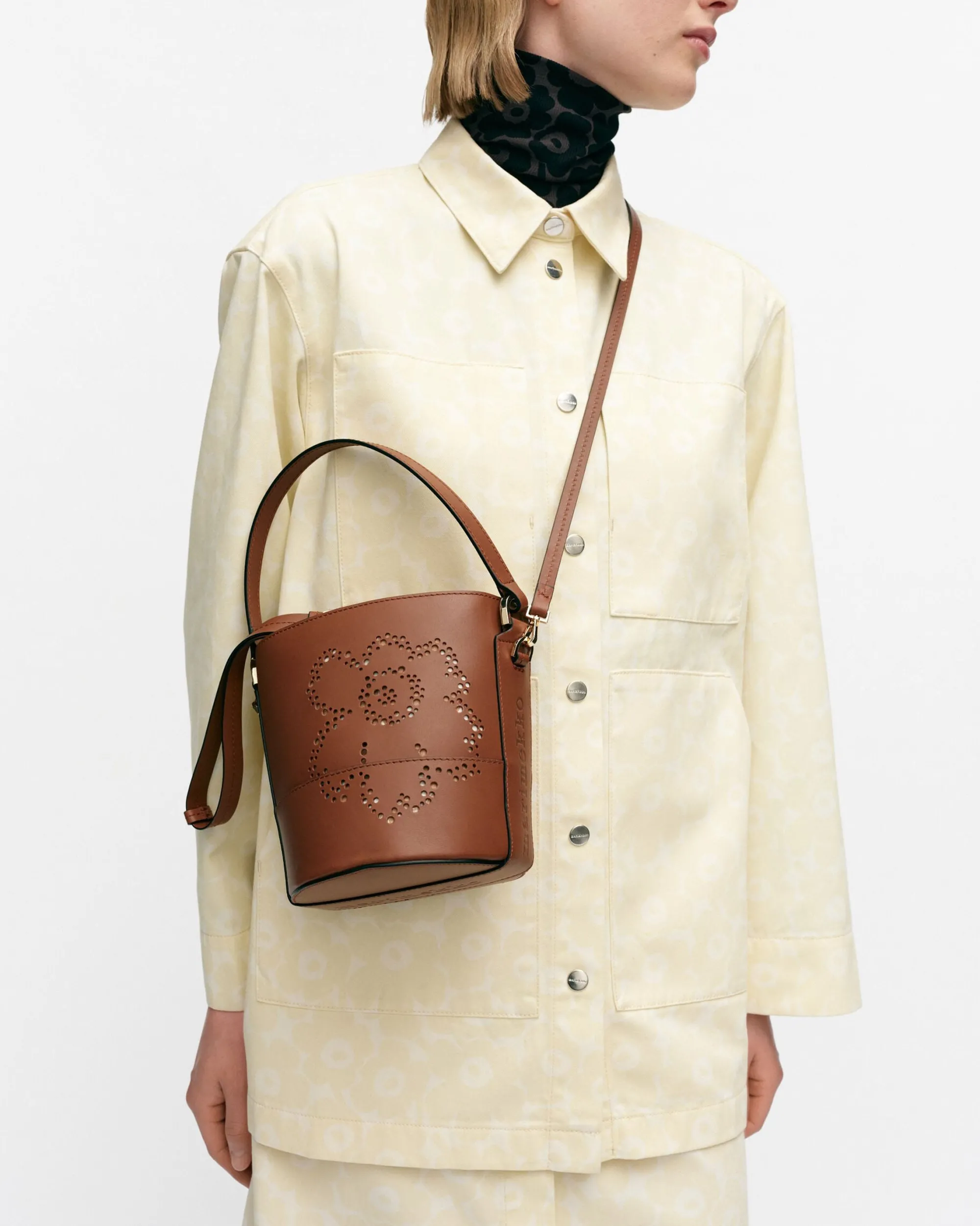 Imprint Small Bucket Unikko -Laukku On Valmistettu Jäljitettävästä Skandinaavisesta Nahasta. Etupuolen Unikko-Kukka Muodostuu Pitsimäisesti Pienistä Rei’Istä. Laukussa On Kantohihna Sekä Irrotettava Ja Säädettävä Olkahihna. Laukun Suuaukko Vedetään Kiinni Nahkahihnojen Avulla Ja Kiinnitetään Stopparilla. Laukussa On Yksi Sisätasku. Sisävuori On Valmistettu Unikko-Kuosisesta Puuvillasta. Marimekko-Logo On Kohokuvioitu Laukun Sivuihin Ja Pohjaan.