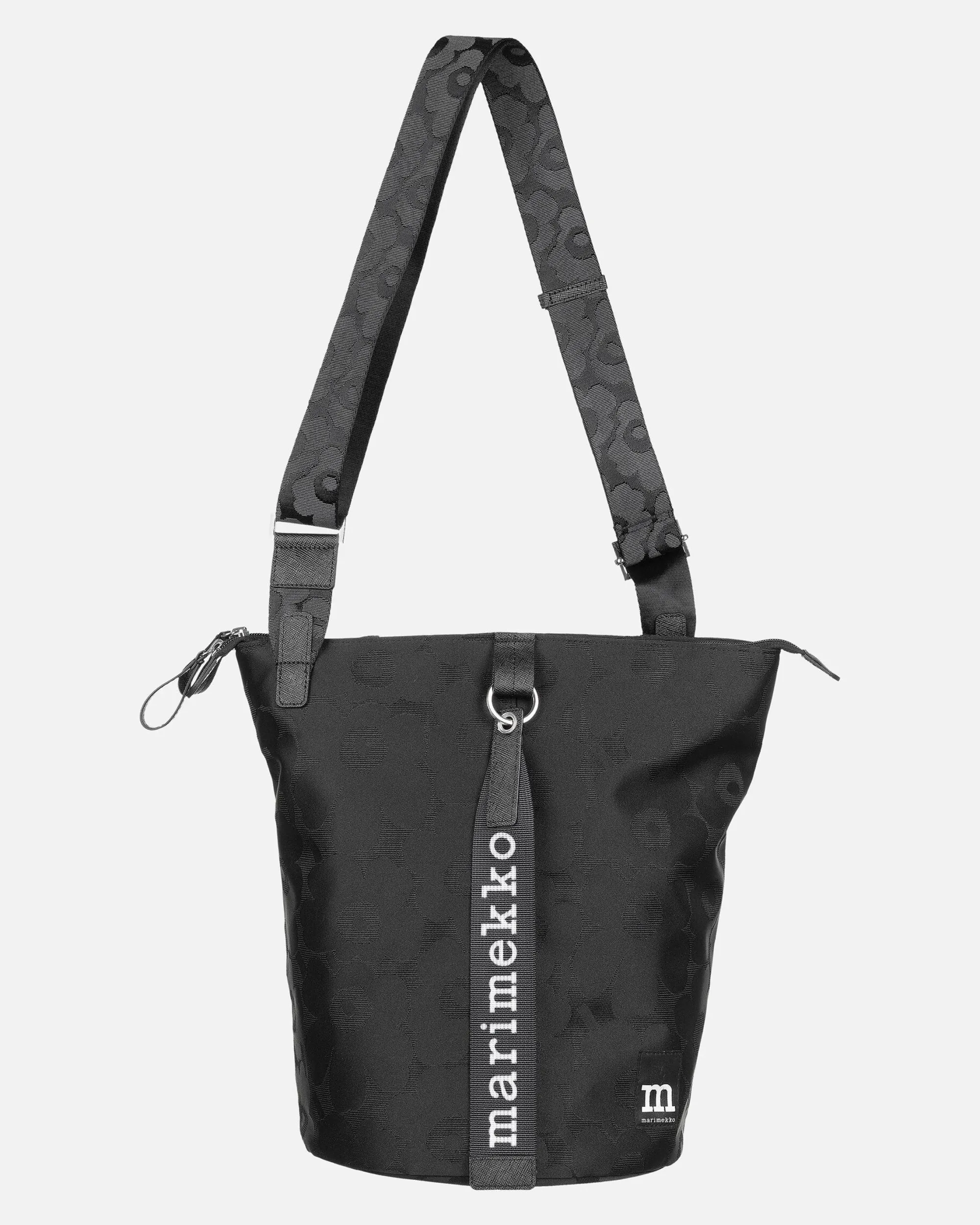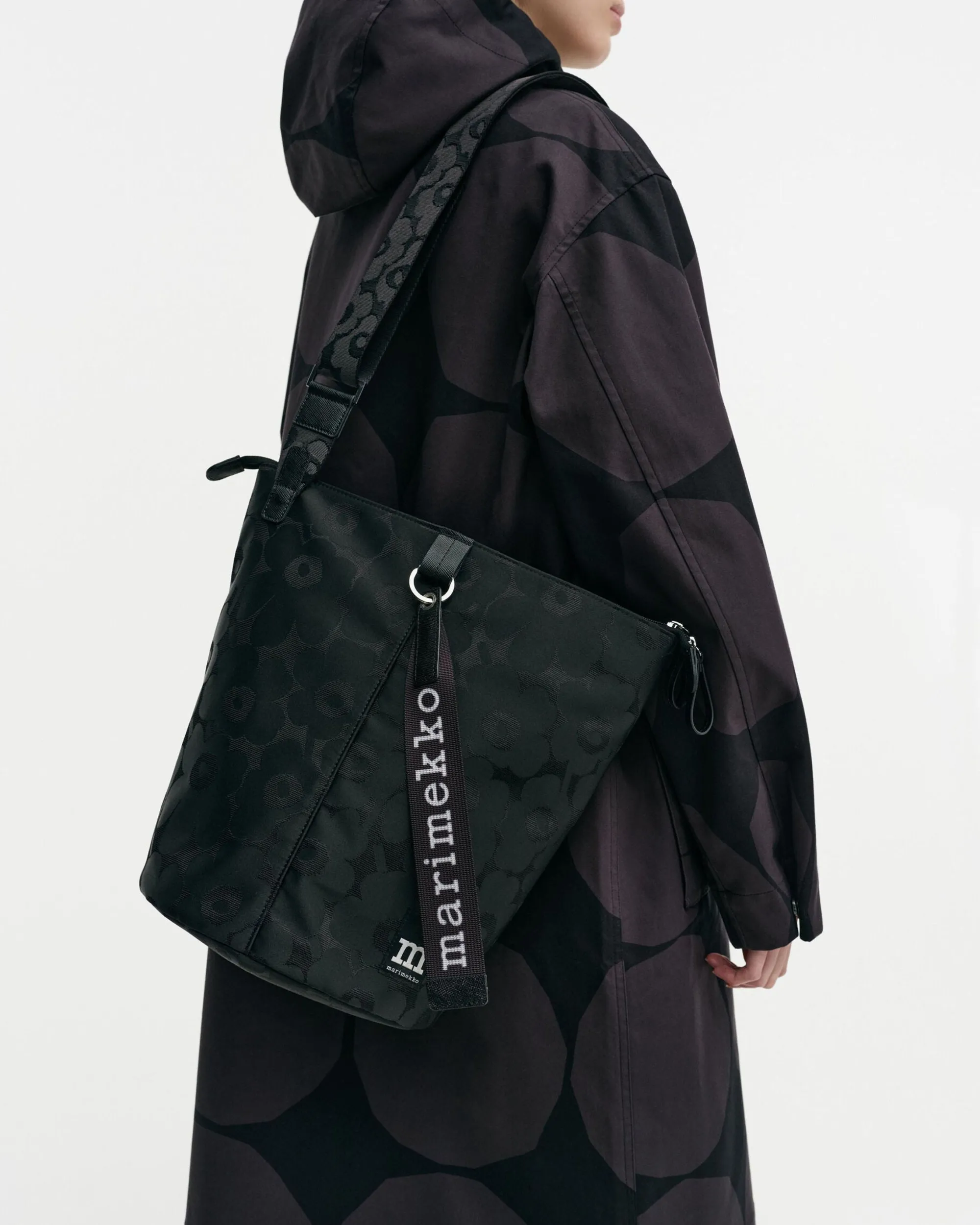 Laukussa On Kolme Osastoa: Yksi Vetoketjulla Suljettava Ja Kaksi Avointa Osastoa, Joista Toisessa On Sisätasku. Laukussa On Säädettävä Olkahihna. Etupuolelle On Kiinnitetty Marimekko-Avaimenperä Ja Takapuolella On Yksi Avoin Tasku, Joka Sulkeutuu Magneettinapilla.