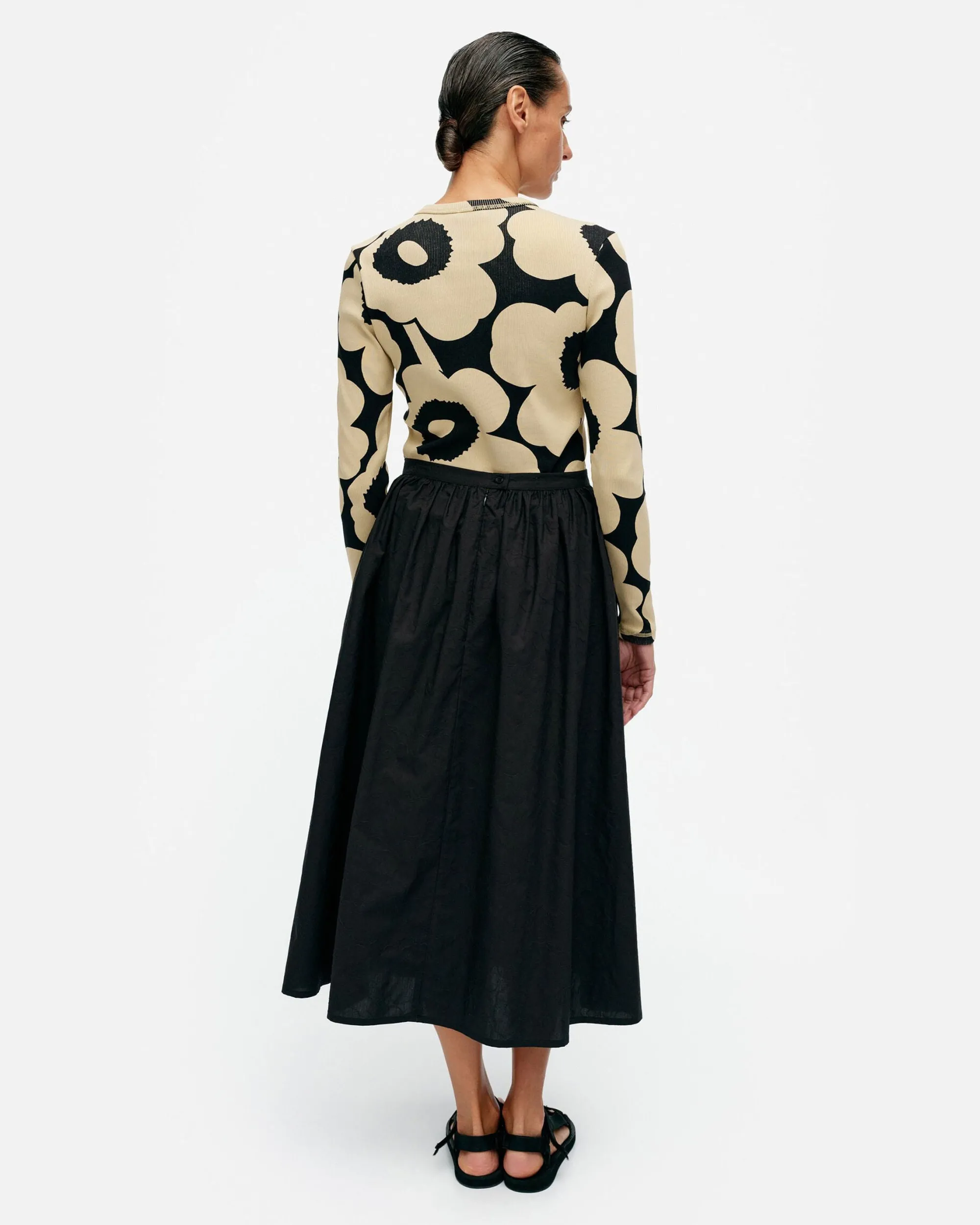 Meimi-Hame On Valmistettu Luomupuuvillapopliinista Ja Siinä On Rento Istuvuus, A-Linjainen Leikkaus Ja Brodeerattu Mini Unikko -Kuosi. Poimutetussa Hameessa On Vyötärökaitale, Jossa On Takana Nappi Sekä Vetoketjusuljenta Takasaumassa.