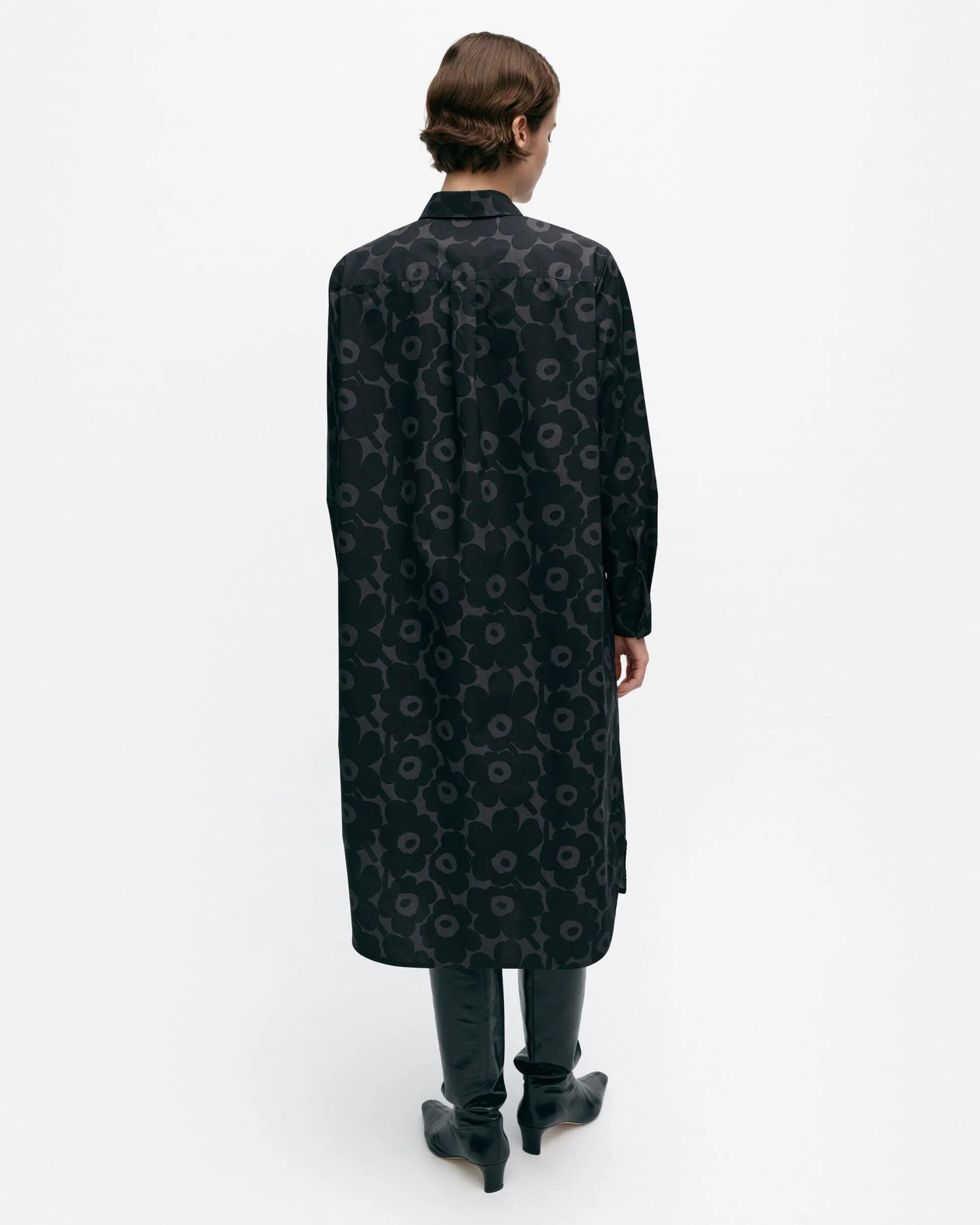 Askare-Paitamekko On Valmistettu Luomupuuvillapopliinista Ja Siinä On Niukka Istuvuus, A-Linjainen Leikkaus Sekä Mini Unikko -Kuosi. Mekossa On Paitakaulukset, Piilonappisuljenta Ja Sivusaumataskut. Hihansuissa On Napitettavat Mansetit Ja Helmassa On Pyöristetty Leikkaus.