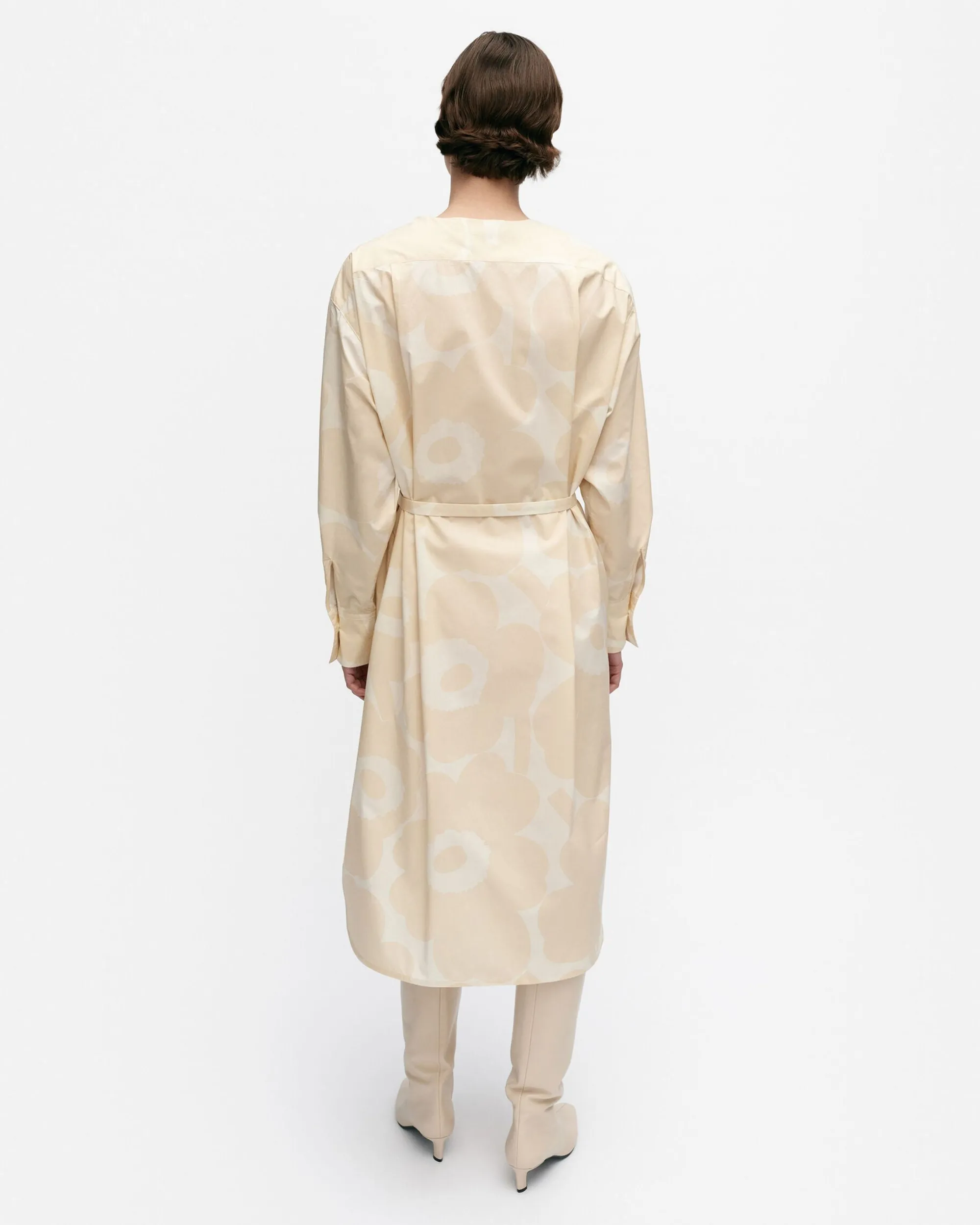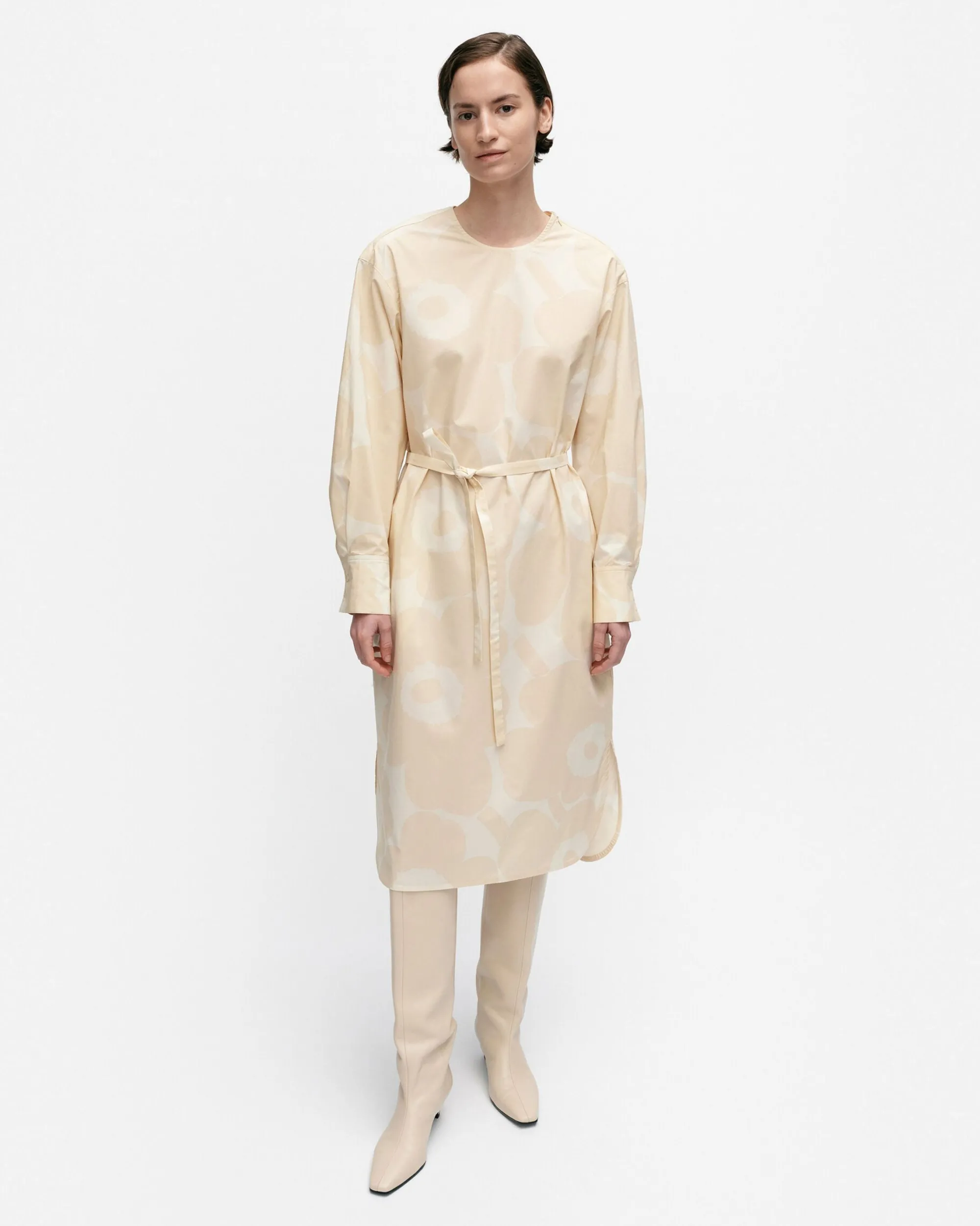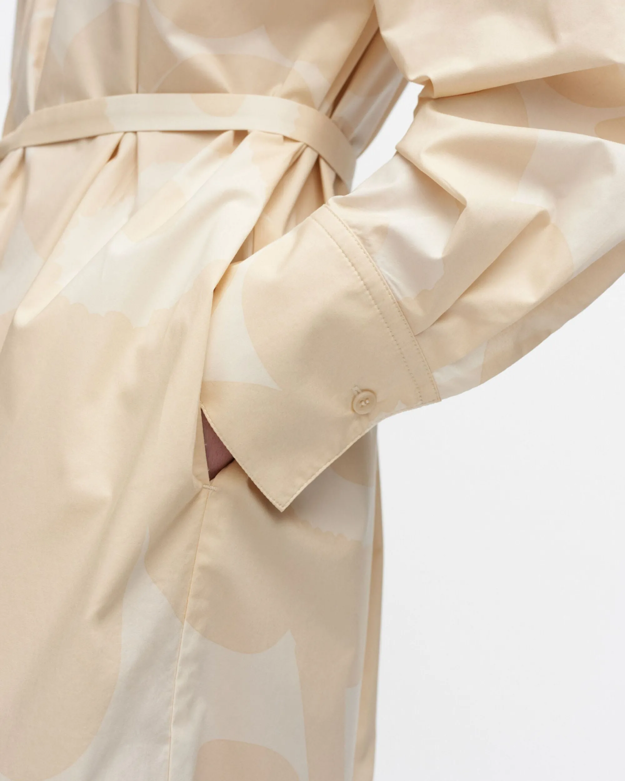 Unikko-Kuosinen Febina-Mekko On Valmistettu Luomupuuvillapopliinista Ja Siinä On Rento Istuvuus Ja Suora Leikkaus. Mekossa On Piilovetoketju Vasemmalla Olalla Ja Kapea, Irrallinen Vyö. Hihansuissa On Halkiot Ja Napitettavat Mansetit Ja Helmassa On Pyöristetty Leikkaus Sekä Sivuhalkiot.