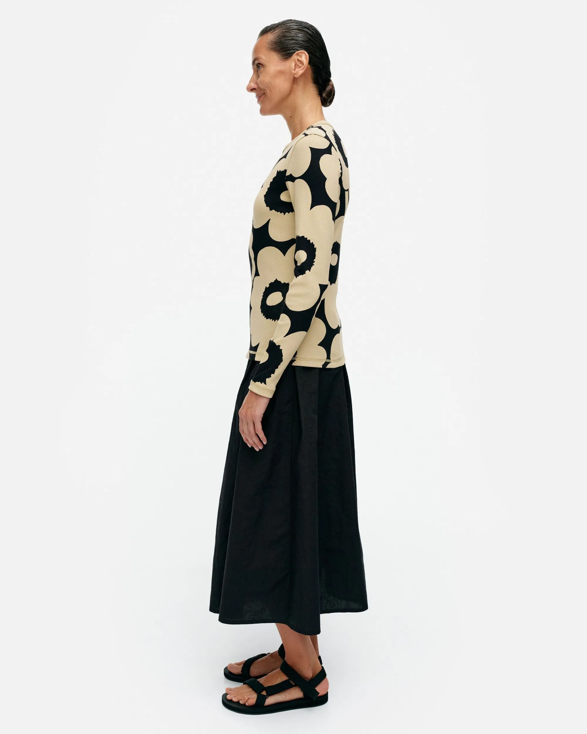 Maija Isola Loi Unikko-Kuvion, Kuviosuunnittelun Kansainvälisen Ikonin, Vuonna 1964. Marimekon Perustaja Armi Ratia Ajatteli, Ettei Kukkien Todellista Olemusta Ole Mahdollista Vangita Kuvioon. Tämän Vuoksi Marimekon Mallistoihin Ei Aiemmin Kukkia Kuulunut. Maija Isola Suunnittelikin Unikko-Kuvion Pikemminkin Abstraktiksi Tulkinnaksi Kuin Fotorealistiseksi Toisinnoksi Kukkateemasta. Tänä Päivänä Unikko On Vahva Ilon Ja Luovuuden Symboli Sekä Tärkeä Osa Marimekon Designidentiteettiä.Koko & Istuvuus