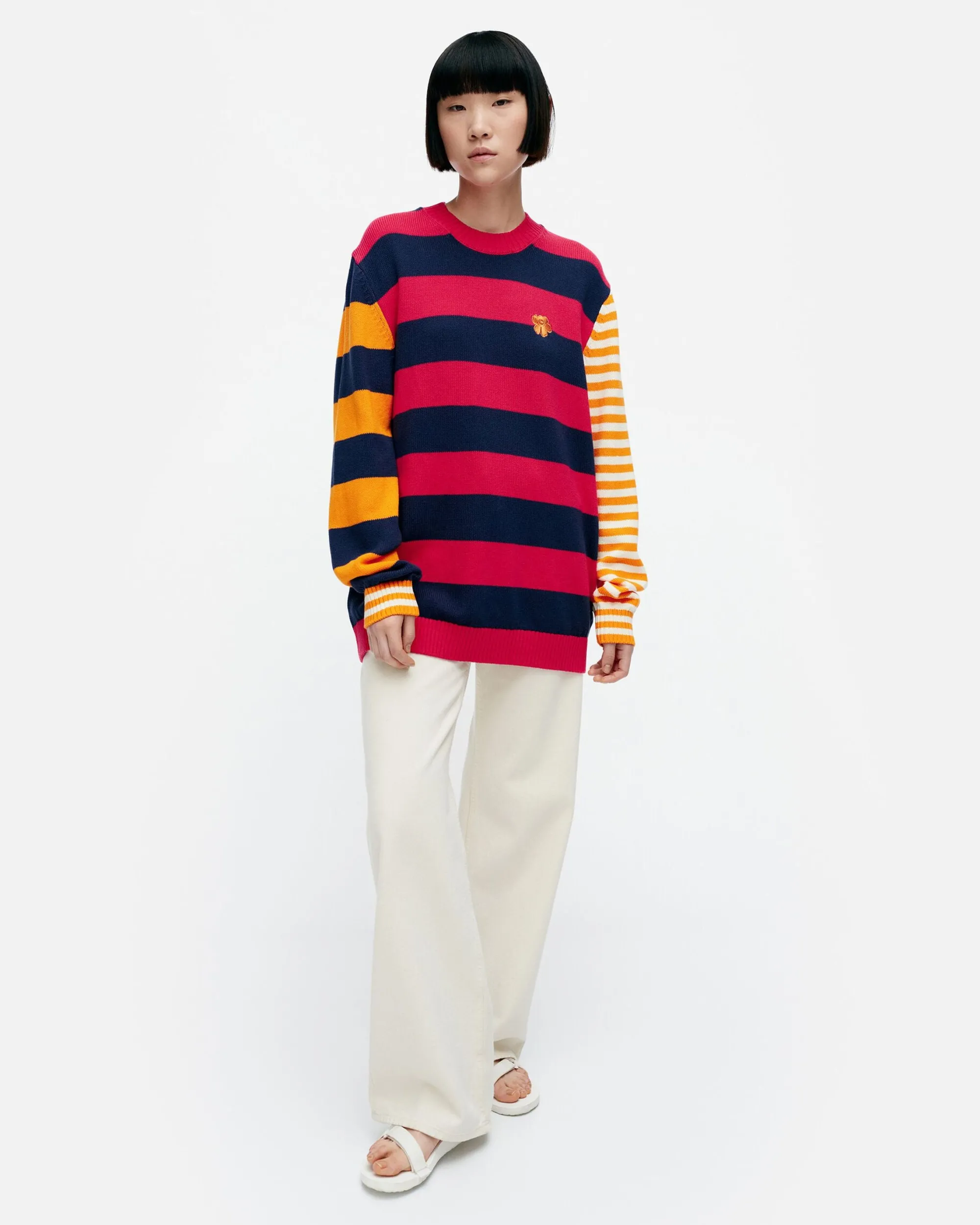 Kesäkoju-Neulepaita On Valmistettu Luomupuuvillasta Ja Siinä On Miesten Mitoitus. Neulepaidassa On Maalis-Kuosia Sekä Patja-Kuosia Ja Siihen On Brodeerattu Pieni Unikko-Kukka Etupuolelle. Pyöreässä Pääntiessä On Tuplaresori Ja Hihansuissa Sekä Helmassa On Leveät Resorit.