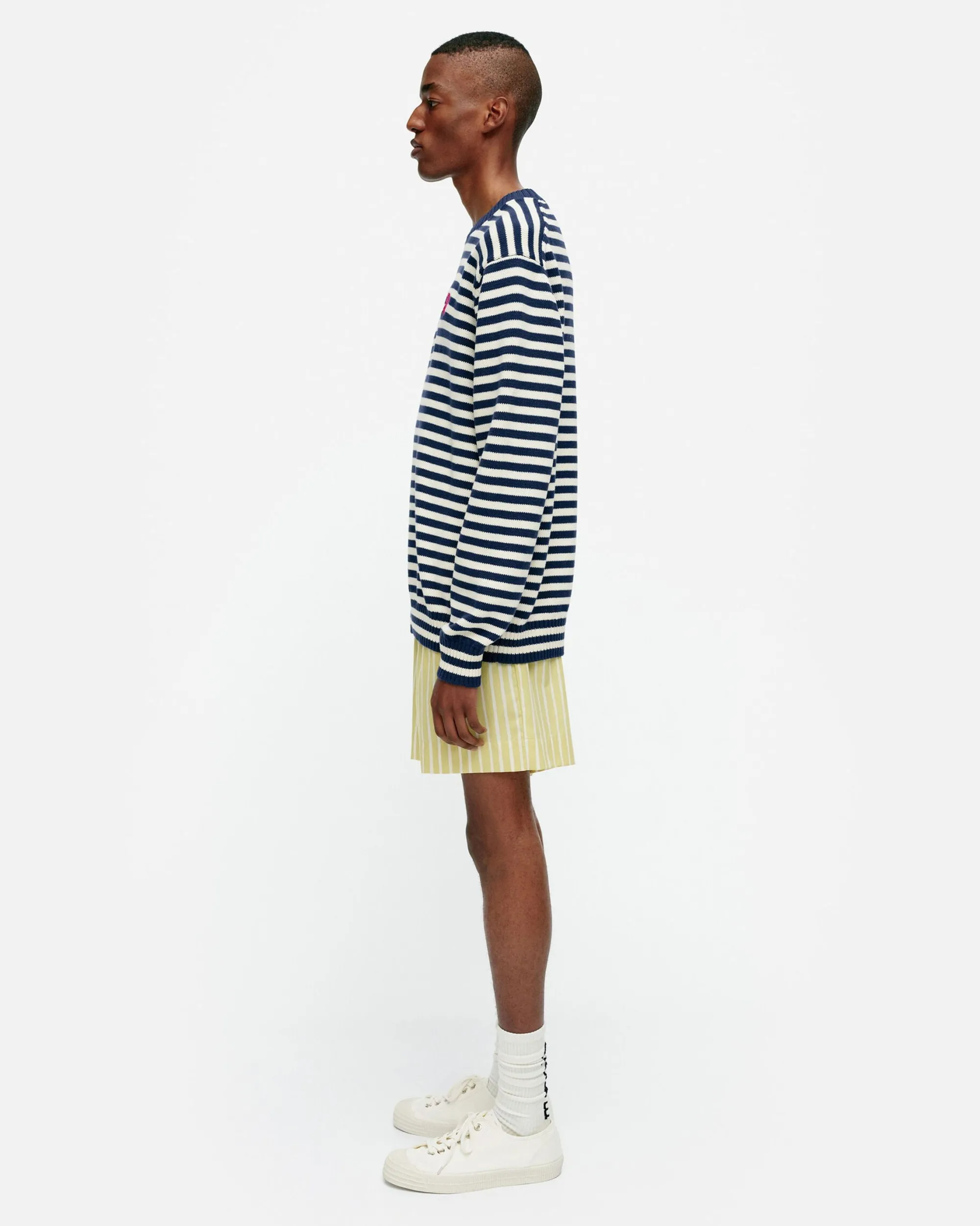 Kesäkoju-Neulepaita On Valmistettu Luomupuuvillasta Ja Siinä On Miesten Mitoitus. Neulepaidassa On Patja-Kuosi Ja Siihen On Brodeerattu Pieni, Fuksian Sävyinen Unikko-Kukka Etupuolelle. Pyöreässä Pääntiessä On Tuplaresori Ja Hihansuissa Sekä Helmassa On Leveät Resorit.